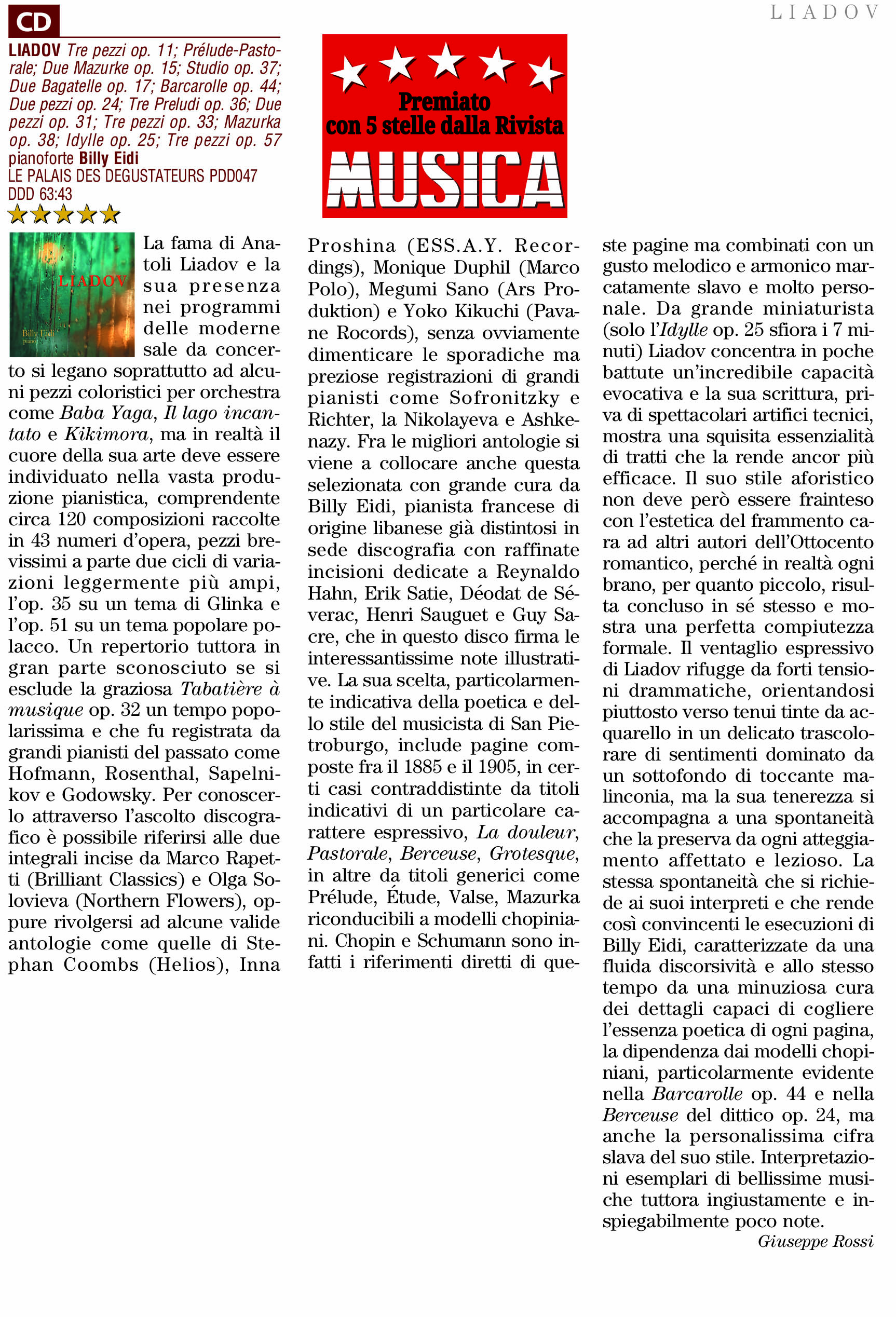 MUSICA : 5 étoiles pour le CD LIADOV de Billy Eidi Le magazine italien Musica décerne 5 étoiles au CD Liadov de Billy EIDI Partagez sur Facebook